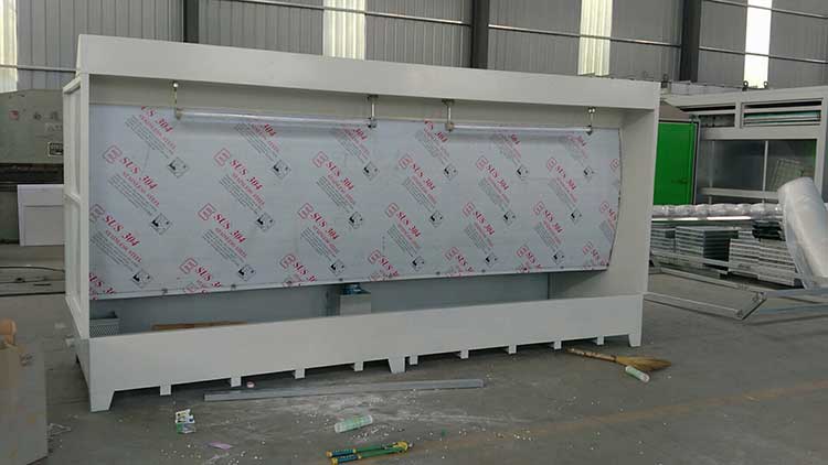 水簾柜工作時,水泵連續向溢流槽供水,使水溢流,在水簾板上形成瀑布狀的水簾。供風機將空氣從室體頂部將新鮮空氣均勻送入,排風機通過水簾與室體形成的通路從水簾下部將操作區的被污染的空氣吸走,從而保證噴室內空氣循環流動。噴漆時,一部分過噴的漆霧碰到水簾板的水簾上,被水沖走至儲水槽內,沒被捕捉的漆霧隨頂部吹下的氣流經過水簾板下部在漆霧洗滌裝置內與水霧充分混合洗滌,氣流內形成的混合漆霧的較大液滴經擋水板阻擋,絕大部分回到儲水槽內,剩余的廢氣再經活性炭吸附箱充分過濾,潔凈的空氣經排氣管路進入大氣。