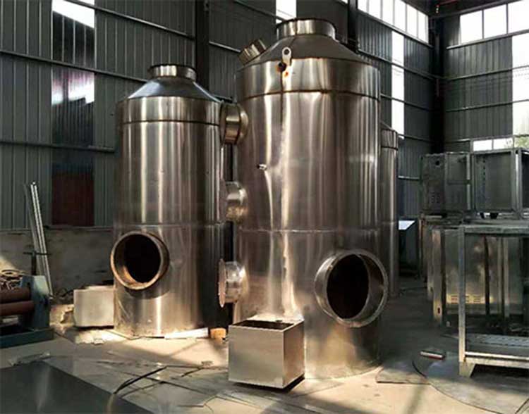 生產設備運行過程中產生的廢氣通過管道由風機引入不銹鋼噴淋塔,在噴淋塔內多級噴淋的混流作用下,廢氣與塔體噴出的吸收液充分接觸。噴漆,SO2和NOx等有機廢氣被吸收液吸收,而廢氣和粉塵在離心力的作用下被甩到塔壁,被塔體內壁的水膜粘附,然后隨吸收液流入沉淀池,定期清洗。凈化后的氣體經氣體除霧層進行氣液分離后,從高空煙囪排入大氣。