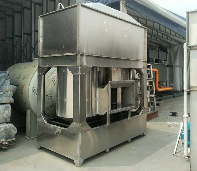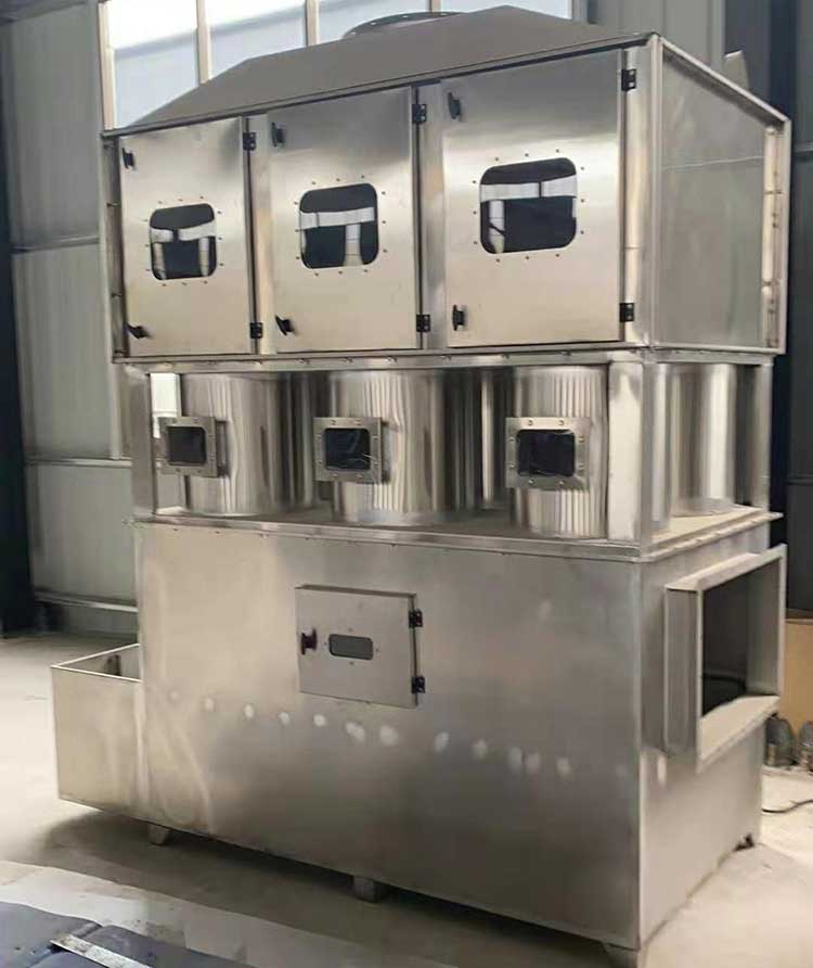 2、旋流板除塵塔內(nèi)安裝有多個“圓形旋流桶”和高效除霧板。旋流桶內(nèi)放有實心填料球,用來凈化粉塵或粘性廢氣,***上層的除霧板用來凈化水霧,達到去除水霧的目的,經(jīng)引風(fēng)機引入的廢氣在塔內(nèi)旋流上升、并在各板上與由塔頂進入的液體旋流接觸,完成除塵、脫硫任務(wù)。旋流板塔在離心力的作用下,煙氣中的顆粒物沉入水池, ***后由人工撈出清理,同時塔內(nèi)的水可以繼續(xù)循環(huán)使用,不會造成污染。經(jīng)過凈化的廢氣,再經(jīng)過后繼凈化設(shè)備處理,使之達到國家排放標準。