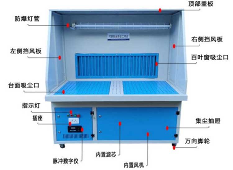 二、打磨除塵工作臺可在不妨礙作業人員運動和視野的情況下捕捉細懸浮粉塵,風機產生的負壓可通過側出口和下部出口吸入到凈化器中。當粉塵進入導流槽后,由于重力的作用,大顆粒粉塵在與導流板碰撞后會掉進灰抽屜,細顆粒的粉塵將與氣體一起到達濾芯。此時,過濾芯表面的灰塵將被堵塞并不斷沉積,凈化后的空氣將從風管中排出。打磨拋光除塵工作臺帶有脈沖吹灰系統,可以自動清除濾筒的灰塵,使濾芯上沉積的粉塵顆粒在振動作用下落入集灰抽屜,不僅方便了工人的使用,而且大大提高了凈化效果,也大大提高了濾筒的使用壽命。 打磨除塵工作臺構成
